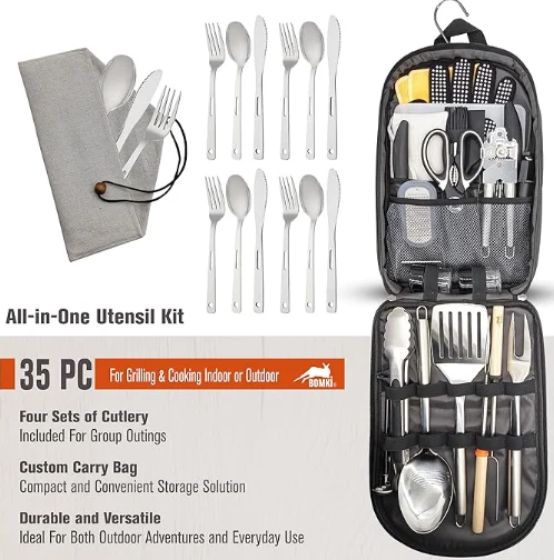 Baaid Awọn ipamọ Iboju-ọna ita gbangba Yara awọn ohun elo sise awọn irinṣẹ siseto ti ṣeto jẹ ojutu pipe fun awọn aini sise ita gbangba rẹ. O pẹlu ibi idana ounjẹ ti a ṣeto ati awọn ohun elo sise mosensizs, gbogbo afati sinu apo aṣa pẹlu awọn ẹgbẹ afikun ati awọn sokoto ẹhin meji. Eto ti a ṣe lati ṣetọju si gbogbo awọn nkan pataki rẹ